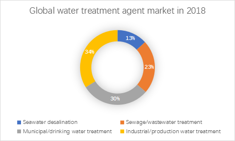 From the perspective of application fields, industrial/production water treatment, municipal/drinking water treatment, sewage/wastewater treatment and seawater desalination water treatment agents are the main downstream fields, and the market size in 2018 was 11.675 billion US dollars, 10.250 billion US dollars, 8.05 billion US dollars and 4.530 billion US dollars, respectively. The market share was 33.88%, 29.74%, 23.23% and 13.15%, respectively.