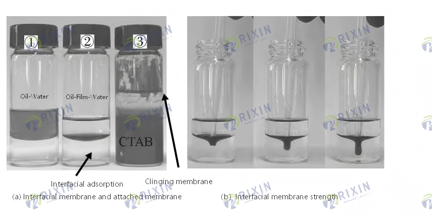 CTAB-Mo S2 exhibits excellent interfacial properties, spontaneously aggregating at the oil-water interface to form a high-strength interfacial film and a significant adhesion film, thereby significantly reducing the interfacial tension between oil and water. CTAB-Mo S2 demonstrates a certain oil displacement effect in low-permeability environments. Injecting only 0.5 PV 0.005% CTAB-Mo S2 into a low-permeability core with a permeability of approximately 50 × 10⁻³ μm² can increase the oil recovery rate by 9.85 percentage points, effectively addressing the problem of poor oil displacement effect caused by deteriorated dispersion stability during the use of nano-displacement agents.