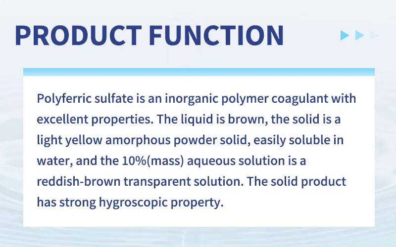 Call to Action Facebook Key attributes CAS No:1327-41-91327-41-9 Purity:98%(±2) Place of Origin:ShaanXi Type:Water treatment agent Usage:Water Treatment Chemicals Classification:Chemical Auxiliary Agent EINECS No:233-072-9 MF:[Fe2(OH)n(SO4)3-n/2]m Other Names:SPFS projectIndexinspection resultAppearanceYellowish-brown or reddish-brown solid powderNormalThe mass fraction of all iron,%≥19.522.6Basicity,%8.0-1614.17PH value,%2.0-3.02.8Reducing substances,%≤0.010.008Insoluble content≤0.40.3