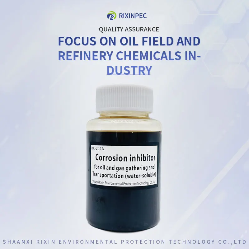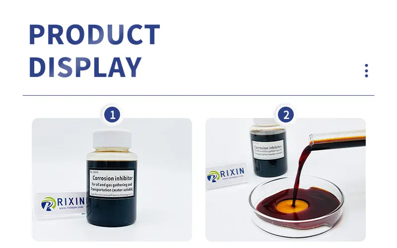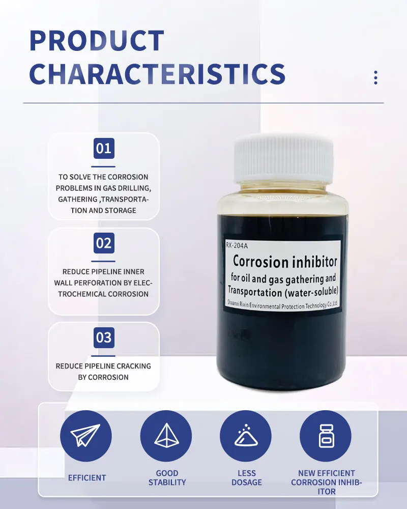 Call to Action Facebook Purity:98%(±2%) Place of Origin:Shanxi, China Type:Corrosion inhibitor Brand Name:RIXIN Classification:Chemical Auxiliary Agent Other Names:Oil corrosion inhibitor Usage:Petroleum Additives Model Number:RX-204A Product Parameters ItemIndexTest methodAppearanceHomogeneous liquidVisualDensity(20℃,g/cm³)0.90~1.20GB/T 4472PH(1%Aqueous solution)6~9GB/T 6920Viscosity of motion(20℃,mm²/s)≤ 15GB/T 265Open flash point(℃)≥ 30GB/T 261Freezing point(℃)≤ -5GB/T 510SolubilityWater dispersion, with no sedimentationSY/T 5273Tendency to emulsifyNo tendency to emulsifySY/T 5273Corrosion inhibition rate(%)≥ 80(The liquid phase)Q/RX 002Corrosion rate(mm/a)≤ 0.076,No local corrosionQ/RX 002StorageStore in a cool, dry and well-ventilated place/EXP1 year/Scope of applicationThis product is suitable for produced water natural gas Wells and natural gas gathering and transportation pipeline anticorrosion.Method of UseAdd according to standard and process, add quantity to meet the site production demand. 1. Usage of gas Wells: They are added to the well through the annular space of the well pipe or casing. 2. Natural gas transmission pipe usage: select one or several dosing points on the pipeline. Call to Action
