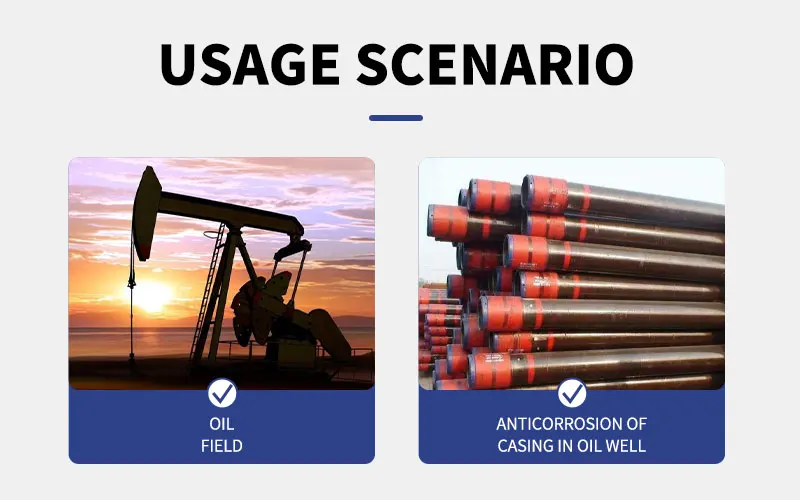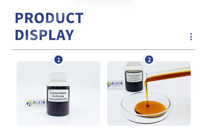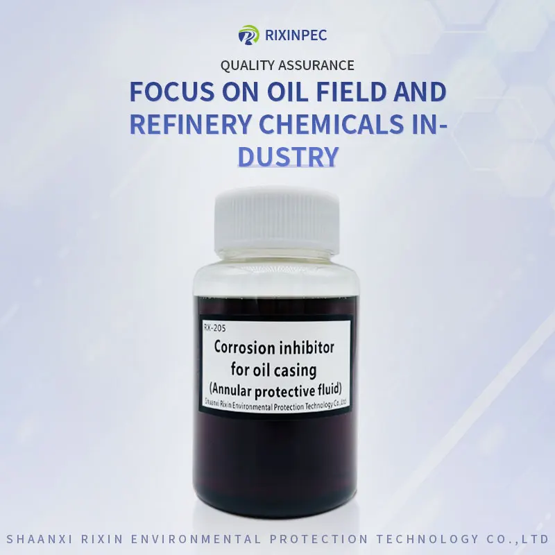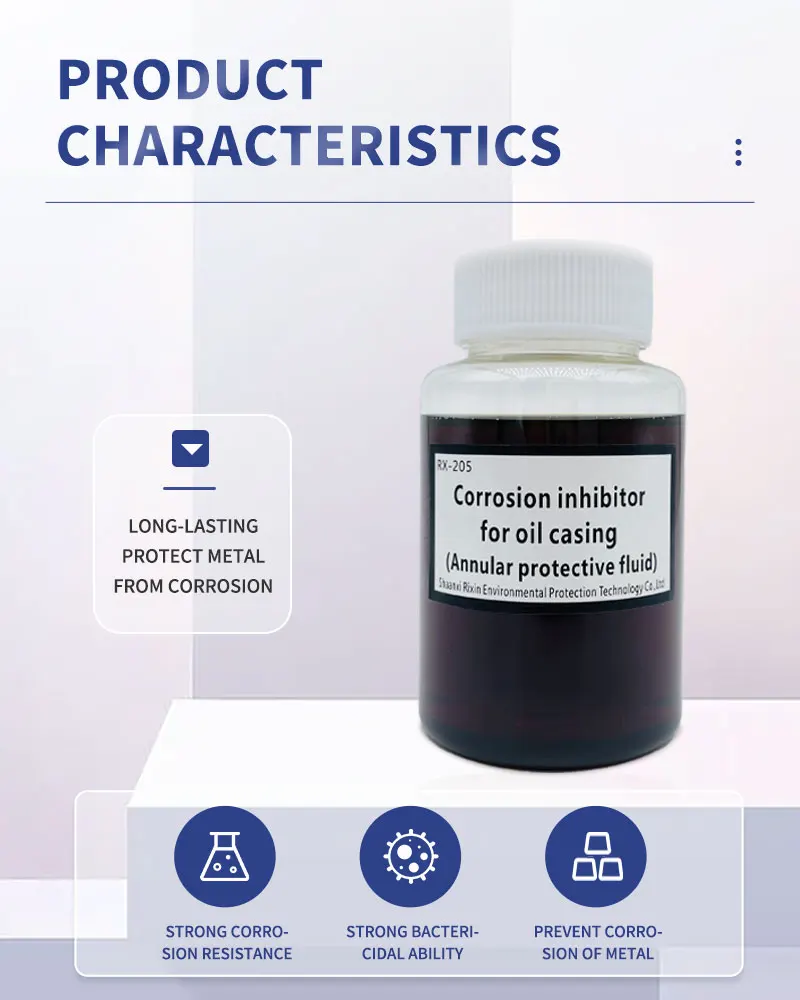 Call to Action Facebook Purity:98%(±2%) Place of Origin:Shanxi, China Type:Chemical additive Brand Name:RIXIN Classification:Chemical Auxiliary Agent Other Names:Oil corrosion inhibitor Usage:Petroleum Additives Model Number:RX-205 Composition:Imidazoline quaternary ammonium salts Product Parameters temIndexTest methodAppearanceYellow to brownish red liquidVisualPH7.0~10.0GB/T 6920Density(20℃,g/cm³)0.85~1.15GB/T 4472Point of freezing(℃,Adapt to environmental requirements)≤ -10GB/T 510SolubilitySlightly soluble in oil and dispersed in waterSY/T 6324.1Solid content(%)≥ 60/StorageStore in a cool, dry and well-ventilated place/EXP1 year/Scope of applicationThis product is suitable for oil well casing anticorrosion.Method of UseDosage: Add 100~200ppm according to the amount of water in the casing, and add the dosage once every three months. Call to Action