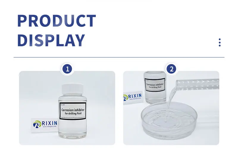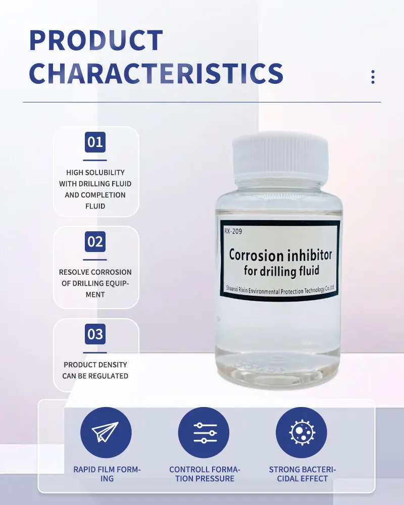 Call to Action Facebook Purity:98%(±2%) Place of Origin:Shanxi, China Type:Chemical additive Brand Name:RIXIN Classification:Chemical Auxiliary Agent Other Names:Oil corrosion inhibitor Usage:Petroleum Additives Model Number:RX-209 Composition:Imidazoline quaternary ammonium salts Product Parameters Item IndexTest methodCorrosion inhibitor for drilling fluid (Water-soluble)Corrosion inhibitor for drilling fluid (Oil-soluble)AppearanceColorless transparent liquidBrown liquidVisualPH≥ 10/GB/T 6920Density(20℃,g/cm³)0.80~1.000.80~1.00GB/T 4472Point of freezing(℃,Adapt to environmental requirements)≤ -10≤ -8GB/T 510Flash point(℃)≥ 48≥ 60GB/T 261Viscosity(mPa·s)≤ 20≤ 50GB/T 265StorageStore in a cool, dry and well-ventilated placeEXP1 yearScope of applicationThis product is suitable for corrosion protection of drilling equipment.Method of UseAdded directly to the drilling fluid or completion fluid, typically in 50-100 PPM increments. Call to Action