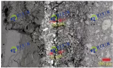 There is a large crack on the cemented surface of the filter cake-cement stone, the curing 2d is 118~186μm, compared with the curing 2d, the crack width of the curing 7d is reduced, about 69~98 μm, the boundary between the two is clear, there are more holes and other defects at the cemented surface, and even serious separation phenomenon occurs. This is mainly due to the poor affinity between the filter cake and the cement stone, and the filter cake is only attached to the surface of the cement stone, resulting in no cementation between the filter cake and the cement stone. Therefore, cementing in the presence of filter cake will greatly reduce the cementing strength of the second cementing interface.