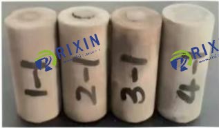After coring, cutting and polishing the rock slab, 8 cylindrical specimens with a diameter of 25mm were obtained. A small hole with a diameter of 10 mm was drilled in the center of the specimen using a precision micro bench drill, and the experimental sample after drilling is shown in Fig. 3. The bottom of the specimen is sealed with a thin piece of rock, and then it is installed in the core gripper to carry out the drilling fluid displacement experiment, so that the drilling fluid is filtered from the inside out, and a layer of filter cake with a relatively uniform thickness is formed on the inner wall of the rock. The rock sample attached to the filter cake is fixed on a rigid plastic plate with epoxy resin, and soaked in water and emulsifier for 20 minutes according to the experimental requirements, and the filter cake is removed as much as possible. During the soaking period, the liquid reduced by the penetration of the inner wall of the rock should be continuously replenished to ensure that the filter cake on the inner wall of the entire rock is immersed in the experimental liquid. After the soaking experiment, pour out the soaking liquid. Carefully inject cement into the inner hole of the rock, gently tap the rock face to eliminate possible remaining bubbles, and constantly replenish the water mud to be level with the rock end face. After the cement is first set, it is transferred to a water bath and maintained in a constant temperature water bath at 85°C for 2 days and 7 days. After the curing, the cement ring (Fig. 4) is taken out, cooled to room temperature, and the acoustic parameters of the cemented surface (first wave amplitude and longitudinal wave velocity) are tested by a rock acoustic tester.